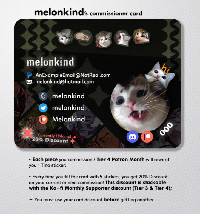 This card serves as a visual tracker for both me and the commissioner, keeping tabs on the amount of stickers a client has, as well as if they currently hold a discount or not.If you plan on being a returning customer I strongly recommend you get a commissioner card, it'll give you access to a 20% discount every time you fill the card with Tino stickers and, if you are a higher tier on my Patreon, you are able to stack both discounts together.Note: Commissioner Cards are private and not shared with anyone.Use the form below to get a card — Note that you don't need to be currently commissioning me to ask for one!